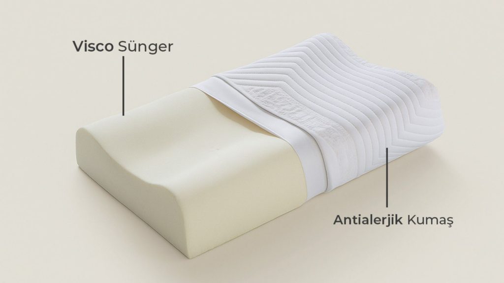 Visco ortopedik yastık, hafızalı sünger olarak bilinen “visco elastik” malzemeden üretilir. Bu malzeme, kişinin baş ve boyun şeklini algılayarak ona göre bir form alır ve basınç ortadan kalktığında eski haline döner. Geleneksel yastıklardan farklı olarak sabit bir şekli yoktur; her kullanımda kullanıcıya özel bir yapı sunar. Aynı zamanda ortopedik formu sayesinde, başın yatış pozisyonuna bağlı olarak boyun omurlarının doğal hizasını korumasına yardımcı olur. Bu, özellikle gece boyunca farkında olunmadan oluşabilecek yanlış pozisyonların önüne geçilmesini sağlar.